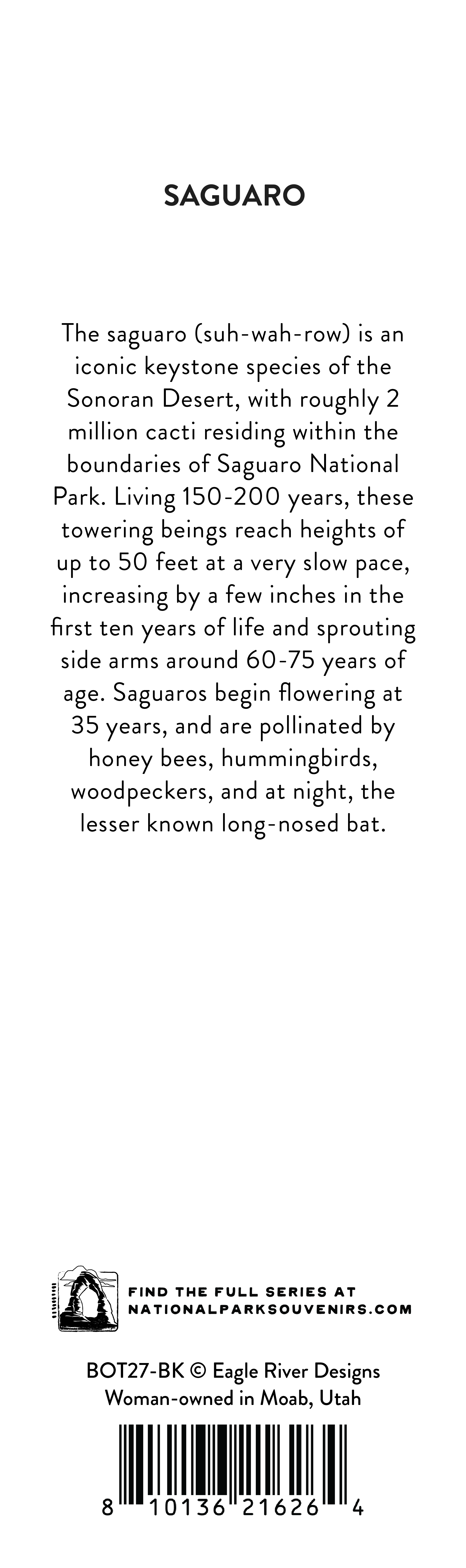 The saguaro (suh-wah-row) is an iconic keystone species of the Sonoran Desert, with roughly 2 million cacti residing within the boundaries of Saguaro National Park. Living 150-200 years, these towering beings reach mature heights of up to 50 feet at a very slow pace, increasing by a few inches in the first ten years of life and sprouting side arms around 60-75 years of age. Saguaros begin flowering at 35 years, and are pollinated by honey bees, hummingbirds, woodpeckers, and at night, the lesser long-nosed bat.