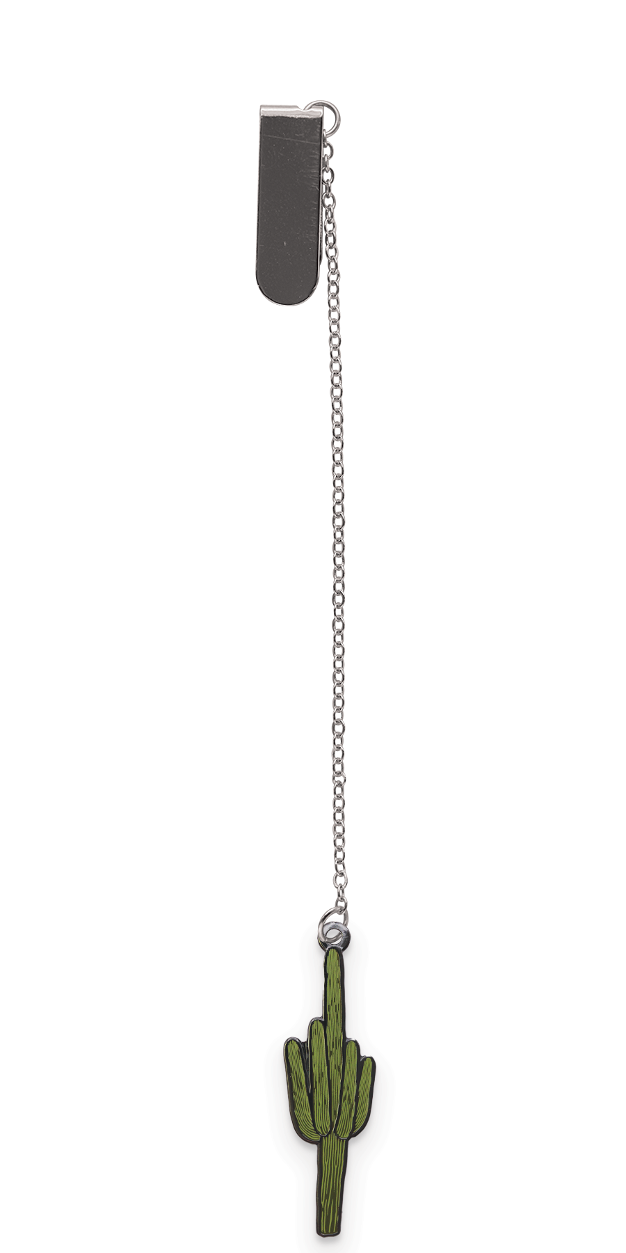 1.5" hard enamel charm w/ black metal finish; page clip attached with 4" silver chain.